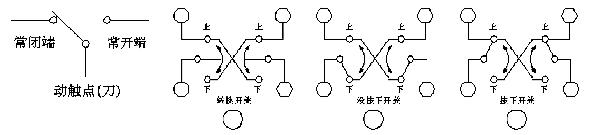 当未按下转换开关时,继电器线包不加电,常闭端与动触点相连接;当按下按钮开关时,继电器吸合,常开端与动触点相连接,实现连接线的转换。由此可知,通过按下、按上转换开关,可以实现与继电器相连的连接线的换向功能。