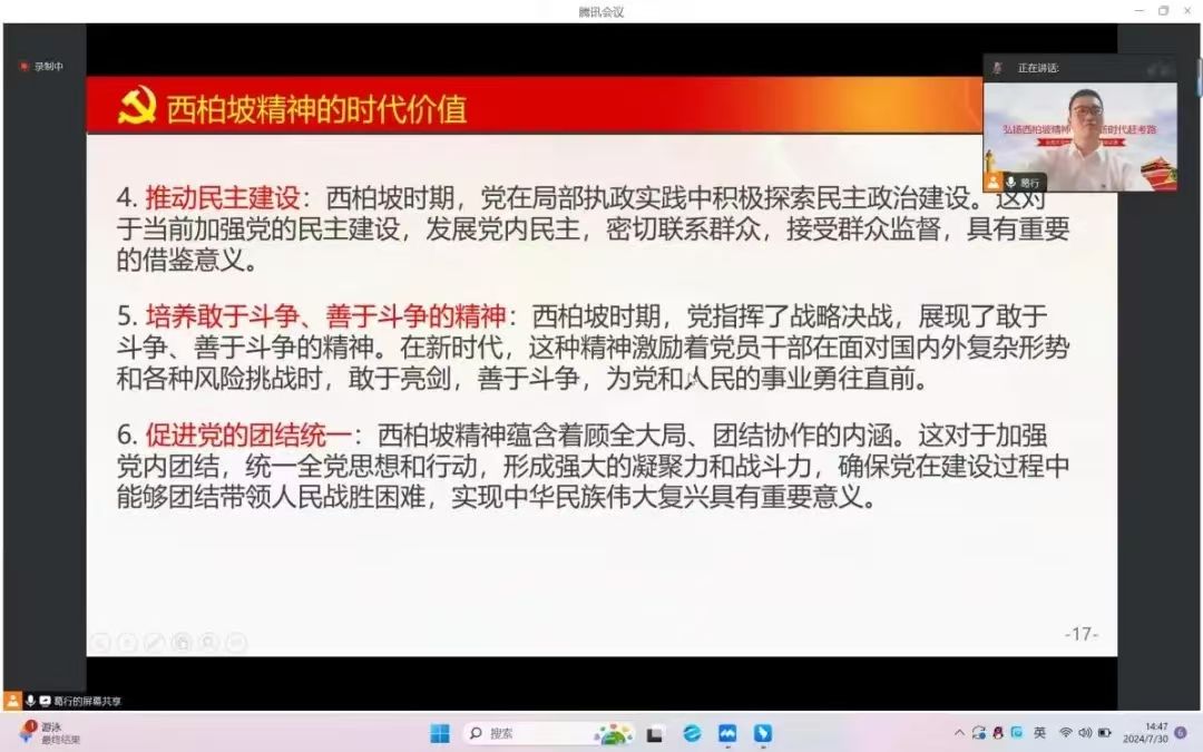 为学习贯彻落实党的二十届三中全会精神,激发员工党员进一步全面深化改革、推进中国式现代化的决心和毅力,7月30日,青言青语宣讲团面向智感机器人师生党支部的全体员工党员开展西柏坡精神宣讲暨党小组专题活动。活动由员工党员陈大嶶组织,员工党员、宣讲团成员葛行主讲,教师党员张佳婧主持。 西柏坡精神是在伟大的革命实践中凝结而成的,对当下仍然具有重大而深远的意义。葛行同志以细致讲解和积极互动的方式,带领大家走进了西柏坡那段波澜壮阔的历史。他结合我们当前进一步全面深化改革、推进中国式现代化的任务,多角度、全方位地进行讲述了西柏坡精神的形成背景、内涵、时代价值以及西柏坡地方特色。在他的精心讲述下,西柏坡故事变得鲜活而生动,让党员同志们深受触动。