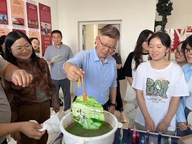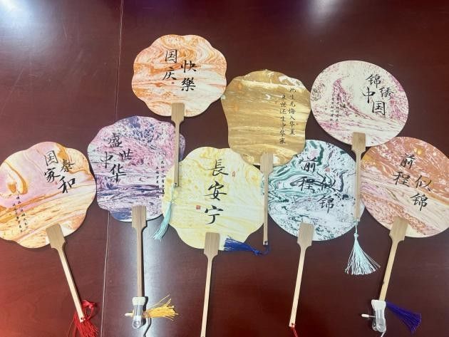 支部坚持学乐并行,以漆为笔,以水为画,绘漆扇传雅韵,献礼中华祝福祖国,漆扇赋予了传统文化以新的时代内涵和现代表达形式,员工党员王杨世豪给大家介绍了漆扇的历史、制作工艺、传承价值以及漆画的技巧。师生们渲染配色,以点、甩、弹、划等手法改变大漆纹路,持扇进入水中绘出图案,美轮美奂的国风漆扇《国庆快乐》《盛世中华》等作品就制作完成了,这些作品不仅展现了中华民族深厚的文化底蕴,更寄托了师生党员对祖国的无限热爱和美好祝愿。
