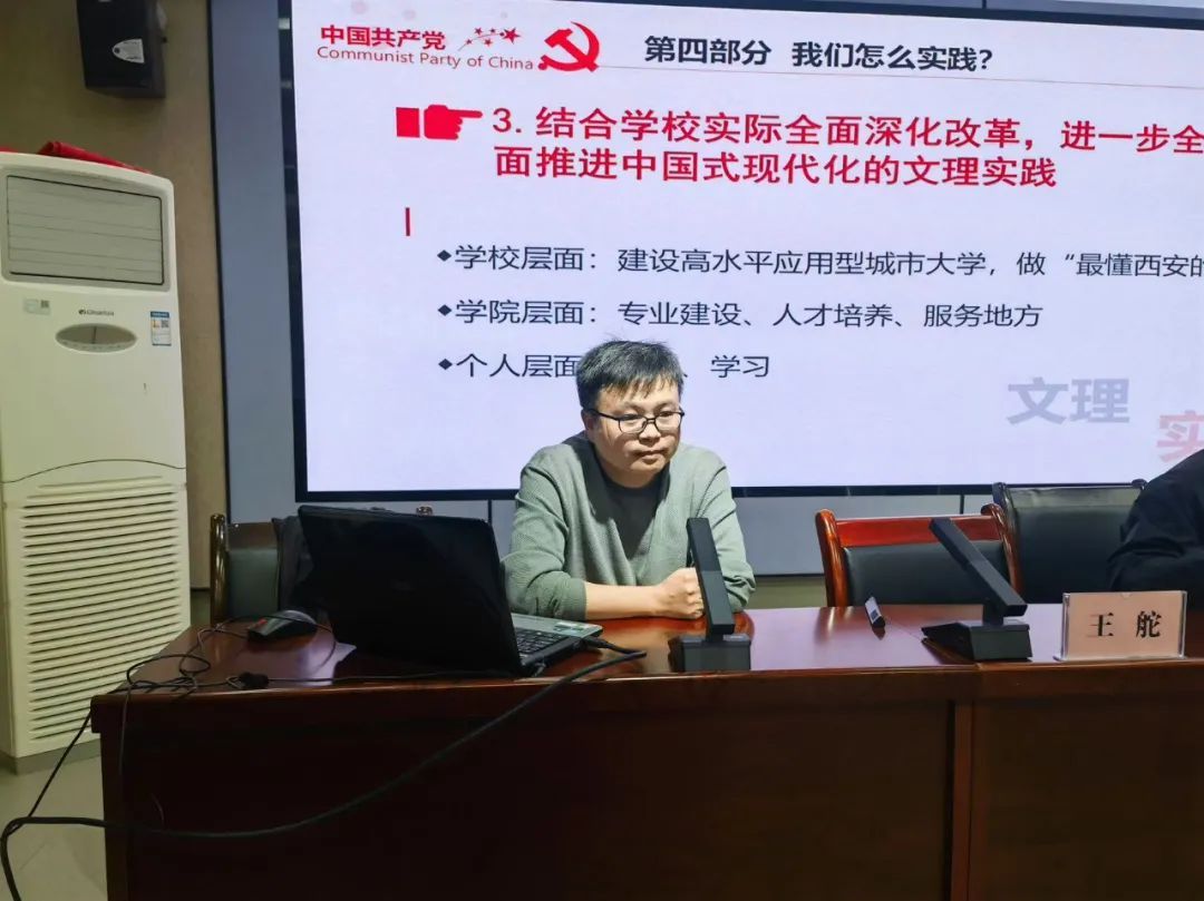 王舵副教授从四个方面对党的二十届三中全会精神进行了宣讲。他首先介绍了全会基本概况,提到全会指出:“要统筹好发展和安全,落实好防范化解房地产、地方政府债务、中小金融机构等重点领域风险的各项举措。要加强舆论引导,有效防范化解意识形态风险。要有效应对外部风险挑战,引领全球治理,主动塑造有利外部环境。”并对此详细解释。第二部阐释了如果看待党的二十届三中全会。着重讲述中国式现代化的逻辑。第三部分享了下一步怎么干,提及应构建支持全面创新体制机制,同时教育、科技、人才是中国式现代化的基础性、战略性支持。必须深入实施科教兴国战略、人才 强国战略、创新驱动战略。第四部分讲述了实践路径,从公司层面展开,提出应结合公司实际全面深化改革,进一步全面推进中国式现代化的文理实践。