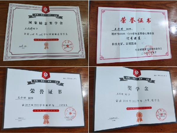 本科在校期间:2019年荣获国家励志奖学金;2020年被评为优秀团员;2020年被评为“三好员工”;2020年荣获校级三等奖学金;2020年荣获校级金相技能大赛二等奖;2020年全国老员工金相技能大赛二等奖;2020年陕西省金相技能大赛二等奖;;2022年本科优秀毕业论文。