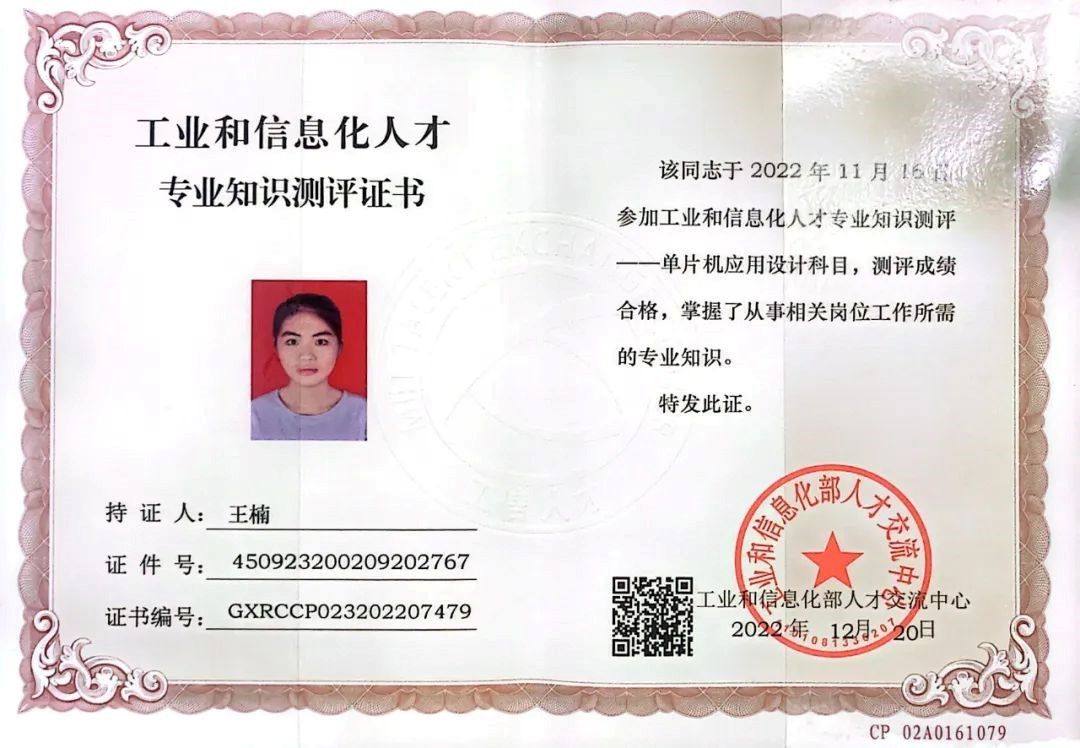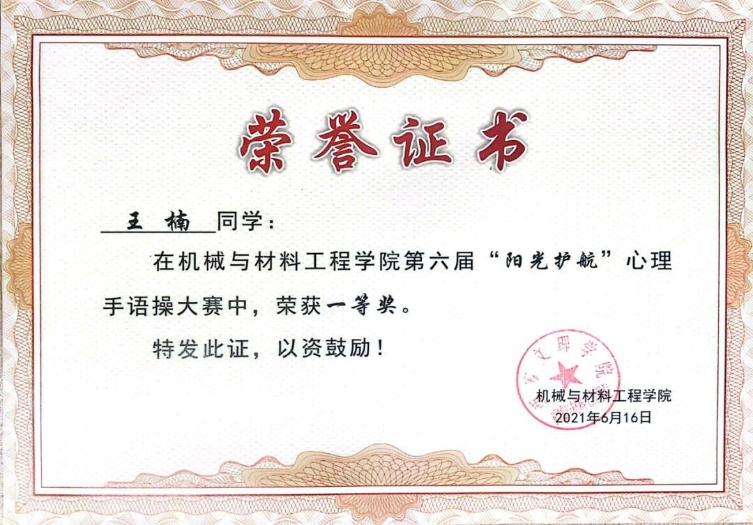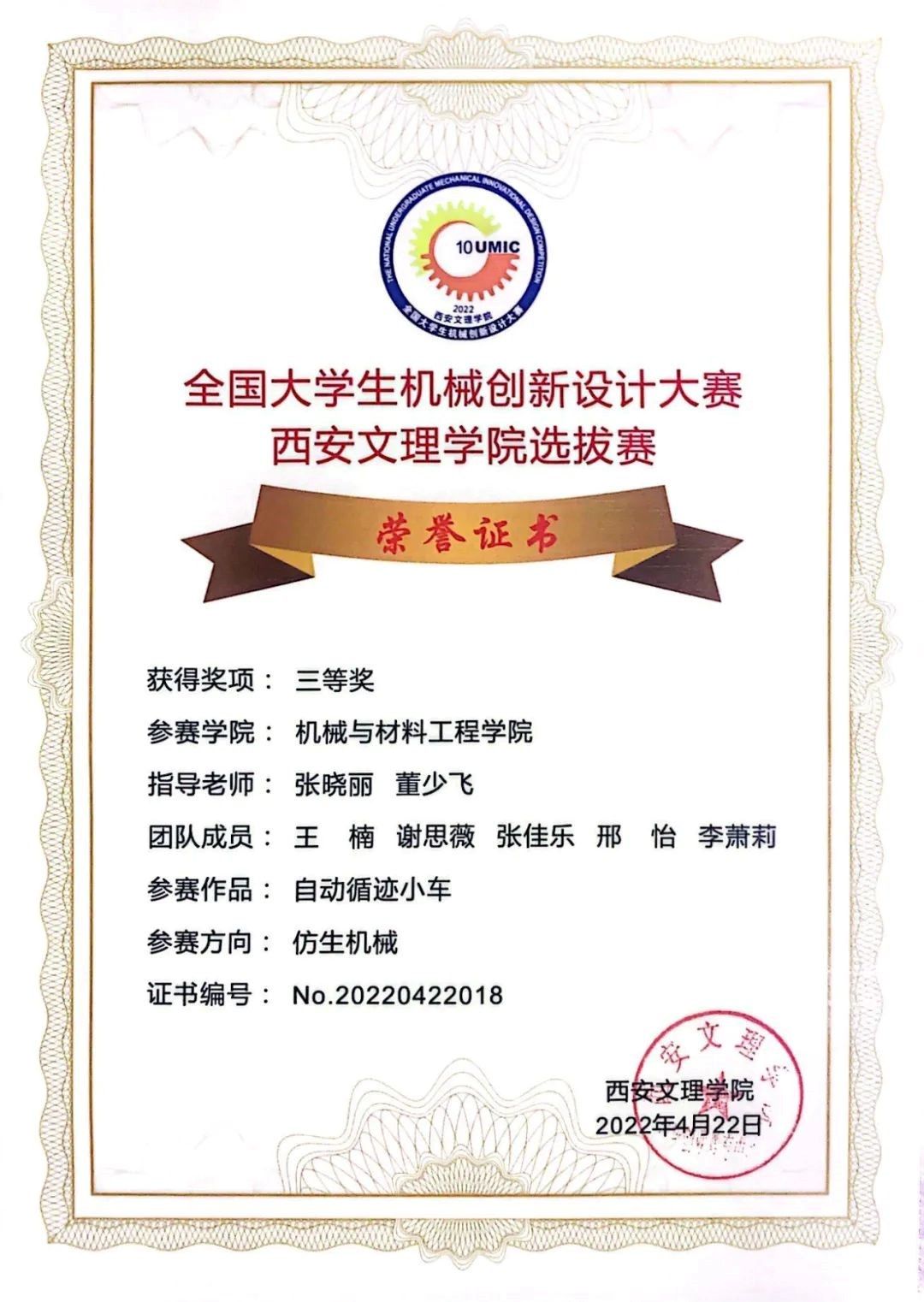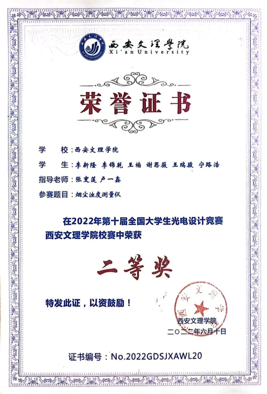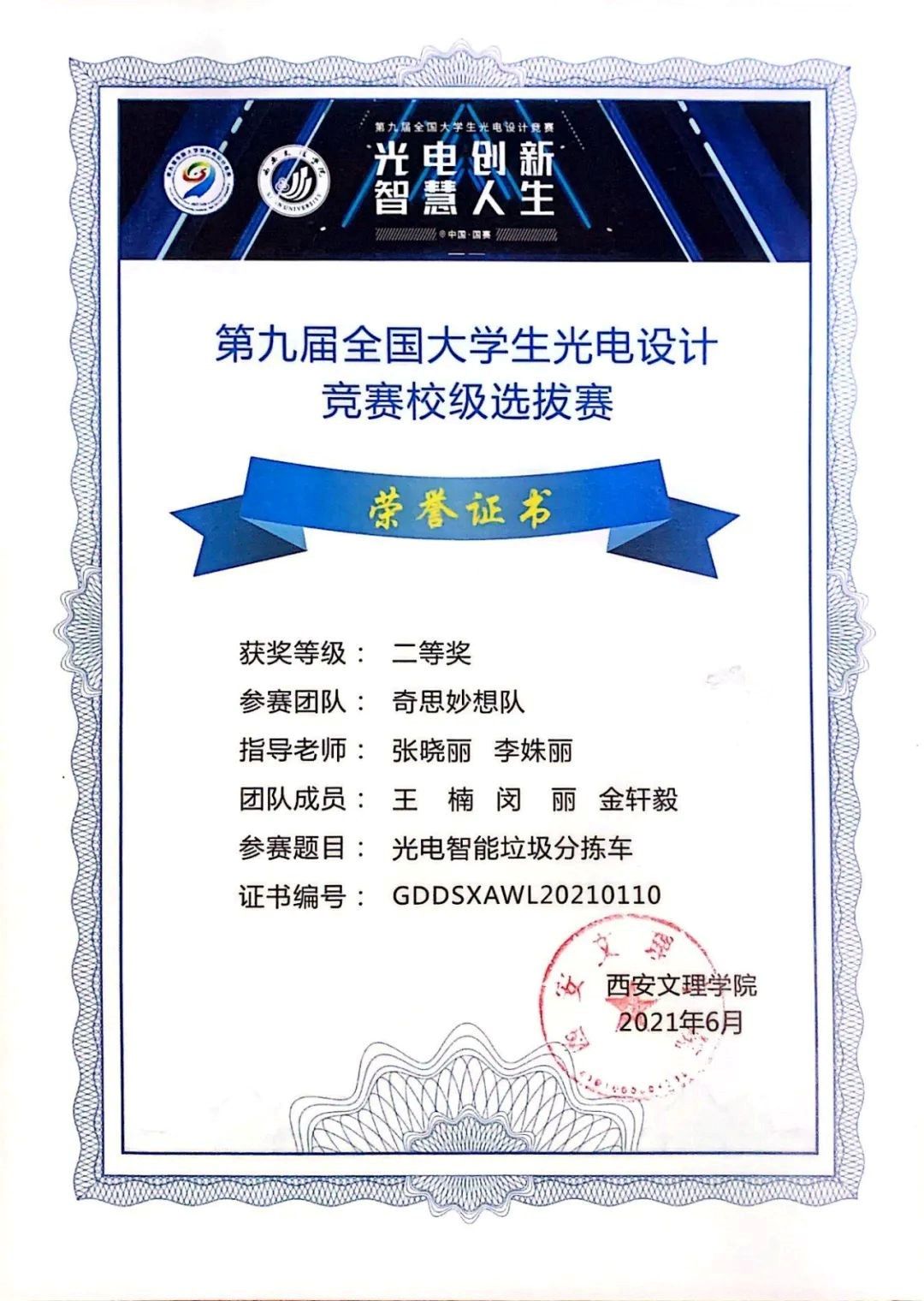 2023年荣获“优秀团员”称号;2022年荣获中国老员工计算机设计大赛省级三等奖;2022年荣获全国老员工机械创新设计大赛校级三等奖;2022年考取工业和信息化人才专业知识测评证书;2021—2022连续两年荣获全国老员工光电设计大赛校级二等奖;2020年荣获西安融创马拉松优秀志愿者、第三届诚信自强之星、第六届“阳光护航”心理手语操比赛一等奖。