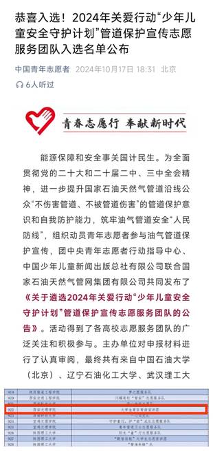 近日,团中央青年志愿者行动指导中心、中国少年儿童新闻出版总社有限公司联合国家石油天然气管网集团有限公司共同发布《关于遴选2024年关爱行动“少年儿童安全守护计划”管道保护宣传志愿服务团队的公告》,必一运动老员工青言青语宣讲团成功入选1000支志愿服务团队!