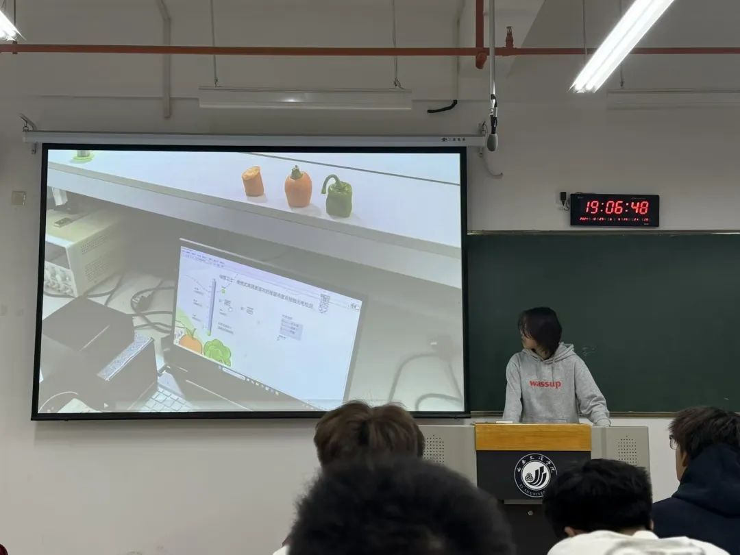 在比赛经历分享环节,张佳怡通过亲身经历的生动案例,带领大家走进了从创意构思到作品完成的精彩过程。讲述了创意如何产生、如何在实践中不断完善,以及遇到技术难题时如何攻坚克难。这一过程充分展现了光电设计的魅力与挑战,使同学们仿佛身临其境,深切感受竞赛的魅力。