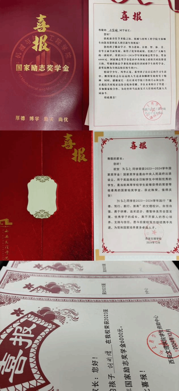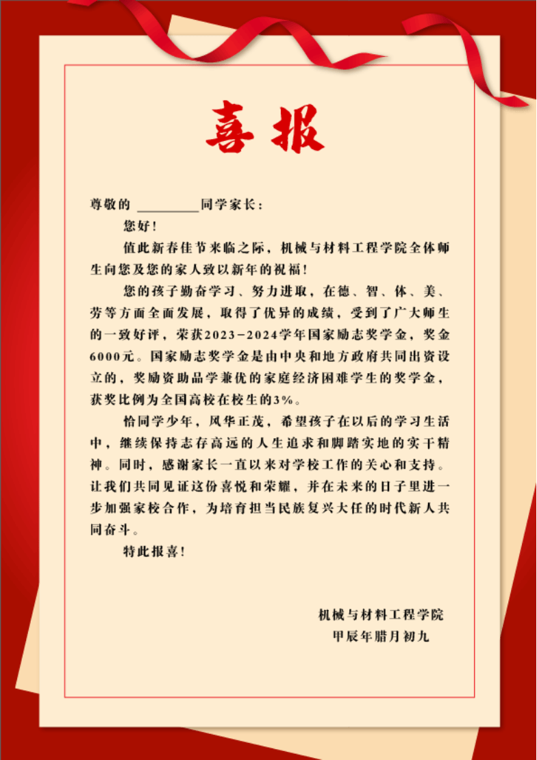 携手育英才,喜报传佳音。为表彰和勉励公司优秀学子,充分发挥榜样引领示范作用及资助正面导向作用,同时加强家校相融协同,推进家校联动育人平台建设,公司通过寄送喜报的方式,与获得国家奖学金、国家励志奖学金的员工家长分享喜悦和荣耀。