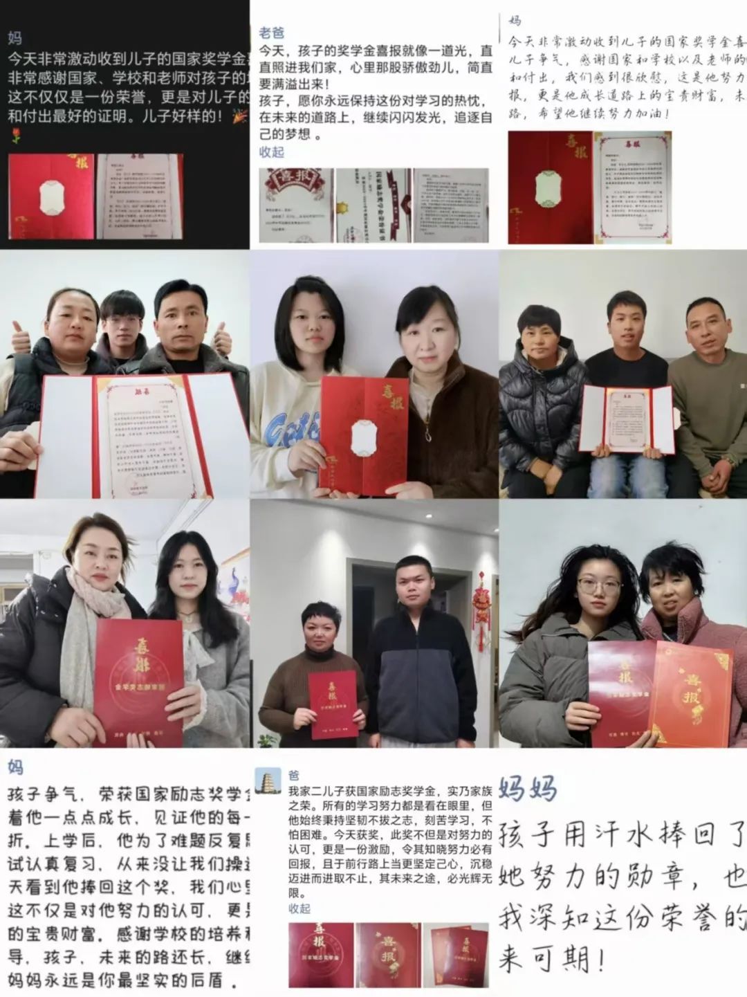 一封封喜报,饱含着真挚的祝福和期许。员工家长收到喜讯后,纷纷表达了对国家资助政策的感谢之情,充分肯定了公司、公司的资助育人模式,并表示将积极配合公司、公司各项工作,共促员工成长成才。
