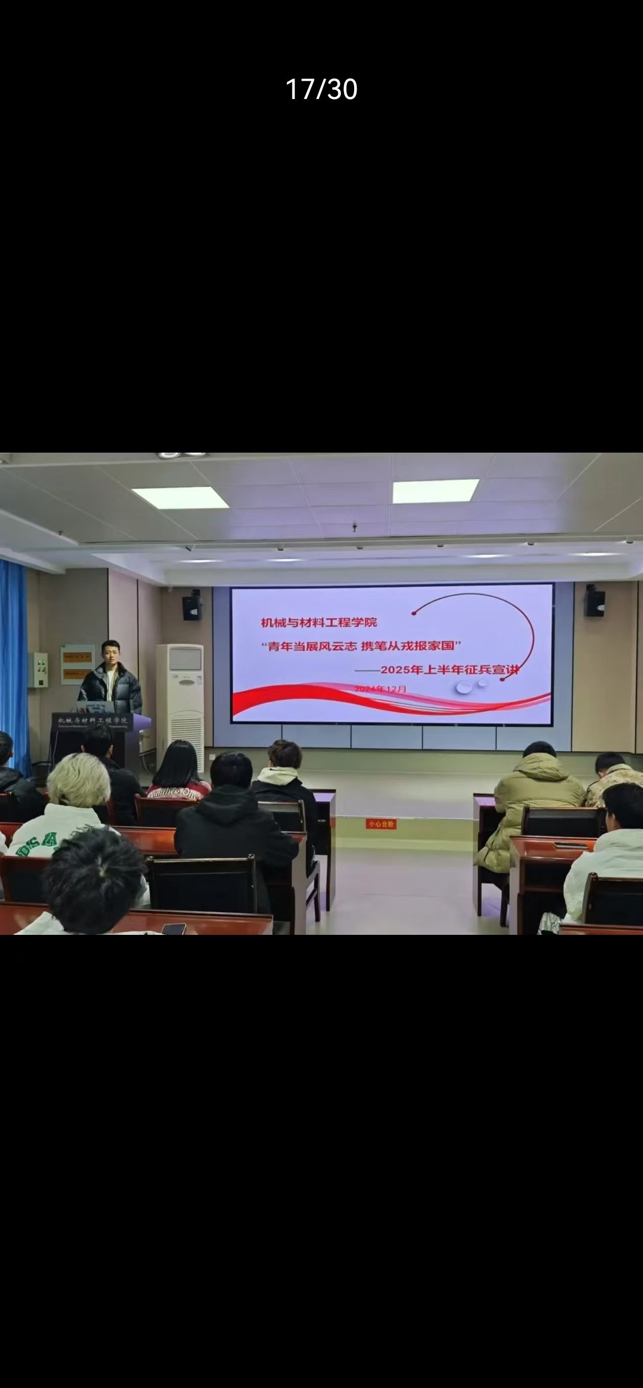 为深入贯彻习近平强军思想,响应国家征兵政策,做好相关征兵工作,激发机材学子参军报国热情,公司特成立由退役军人以及员工干部组成的征兵宣讲团,12月6日公司举行了“青年当展风云志 携笔从戎报家国”征兵宣讲会,本次会议由征兵专责张佳婧主持,百余名符合入伍条件的员工以及公司征兵宣讲团成员参加宣讲会。