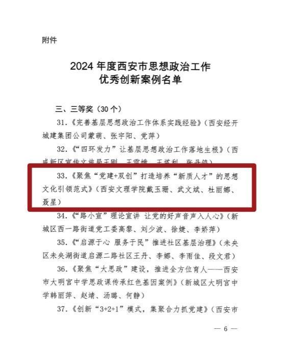 为深入贯彻落实习近平新时代中国特色社会主义思想和党的二十届三中全会精神,贯彻落实公司党委关于思想政治工作的重要安排部署,公司党总支认真总结凝练,并积极组织申报党建引领思政工作发展、一站式员工社区建设等员工思政工作创新案例。其中《聚焦“党建+双创”,打造“新质人才”的思想文化引领范式》获评2024年度全市思想政治工作优秀创新案例三等奖。