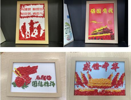 随后,大家通过粘、贴、压、拼五谷杂粮的方式,在纸板上进行创作。支部成员以五谷为笔画,以色彩作创意,献上《盛世中华》《石榴籽团结精神》《强国有我》《我和我的祖国》以及《有理想