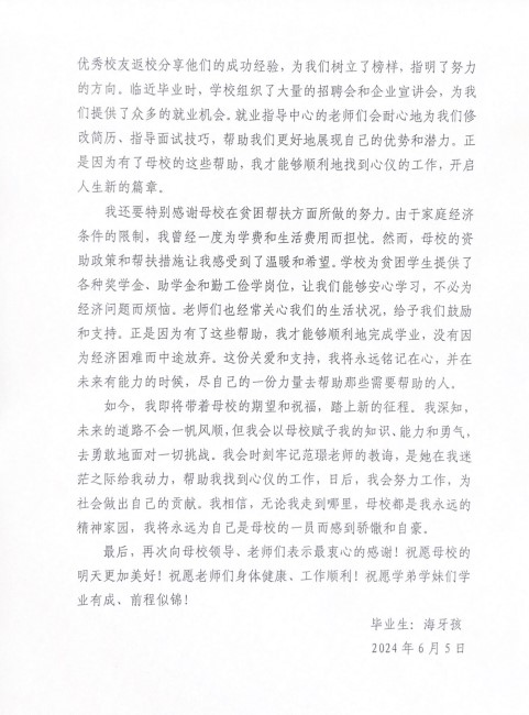 纸笺传心意,浓浓感激情。恰逢毕业季,必一运动自动化专业2001班少数民族毕业生海牙孩同学给公司送来了一封暖心感谢信。在校四年,海牙孩同学获得了公司、公司在学习、生活等方面的关心关爱,在专业知识、综合素质方面得到了长足的发展,获得了走向社会的宝贵财富。